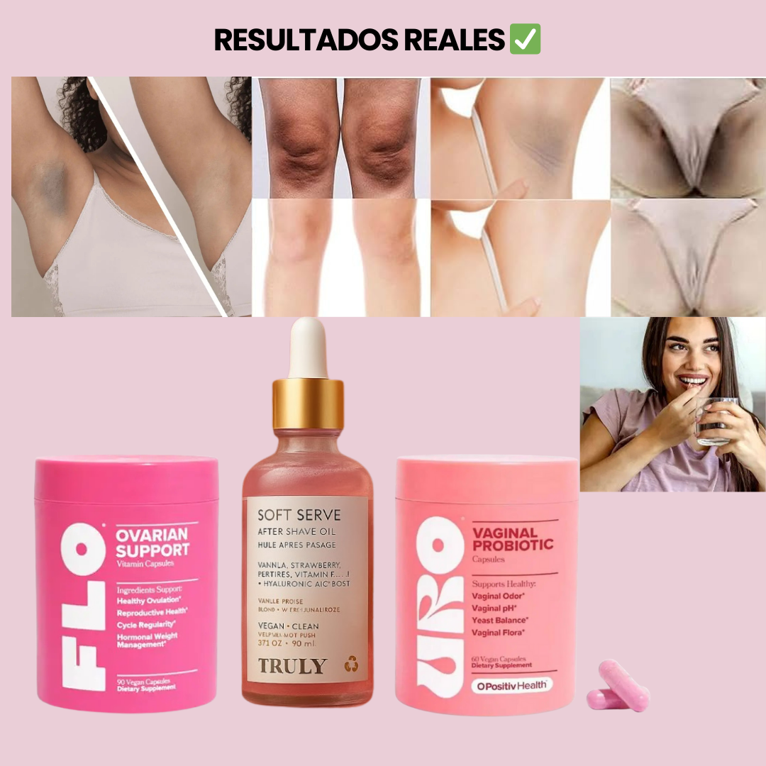 Tu piel luce más suave, sin irritación ni manchas, mientras al mismo tiempo disfrutas de un ciclo menstrual más regulado y una salud íntima equilibrada. Este combo no solo cuida tu belleza exterior, también trabaja desde adentro para darte confianza, frescura y bienestar integral.
